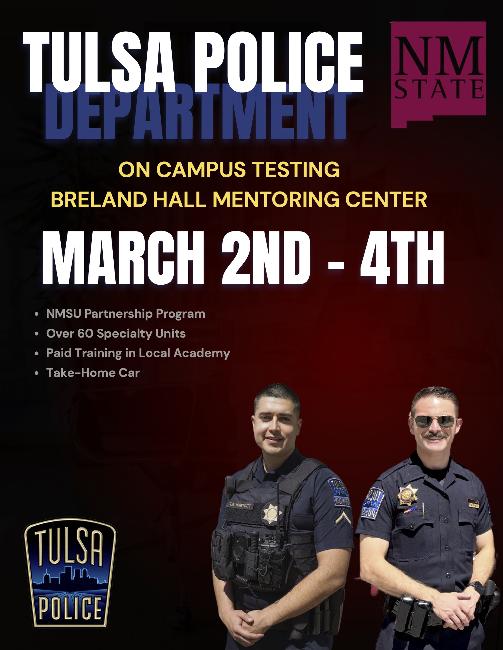 The Department of Criminal Justice at New Mexico State University partners with the Tulsa Police Department! This collaboration introduces a dynamic paid internship program, giving our criminal justice students the incredible opportunity to gain hands-on law enforcement experience while completing the final 15 credit hours needed for their degrees.